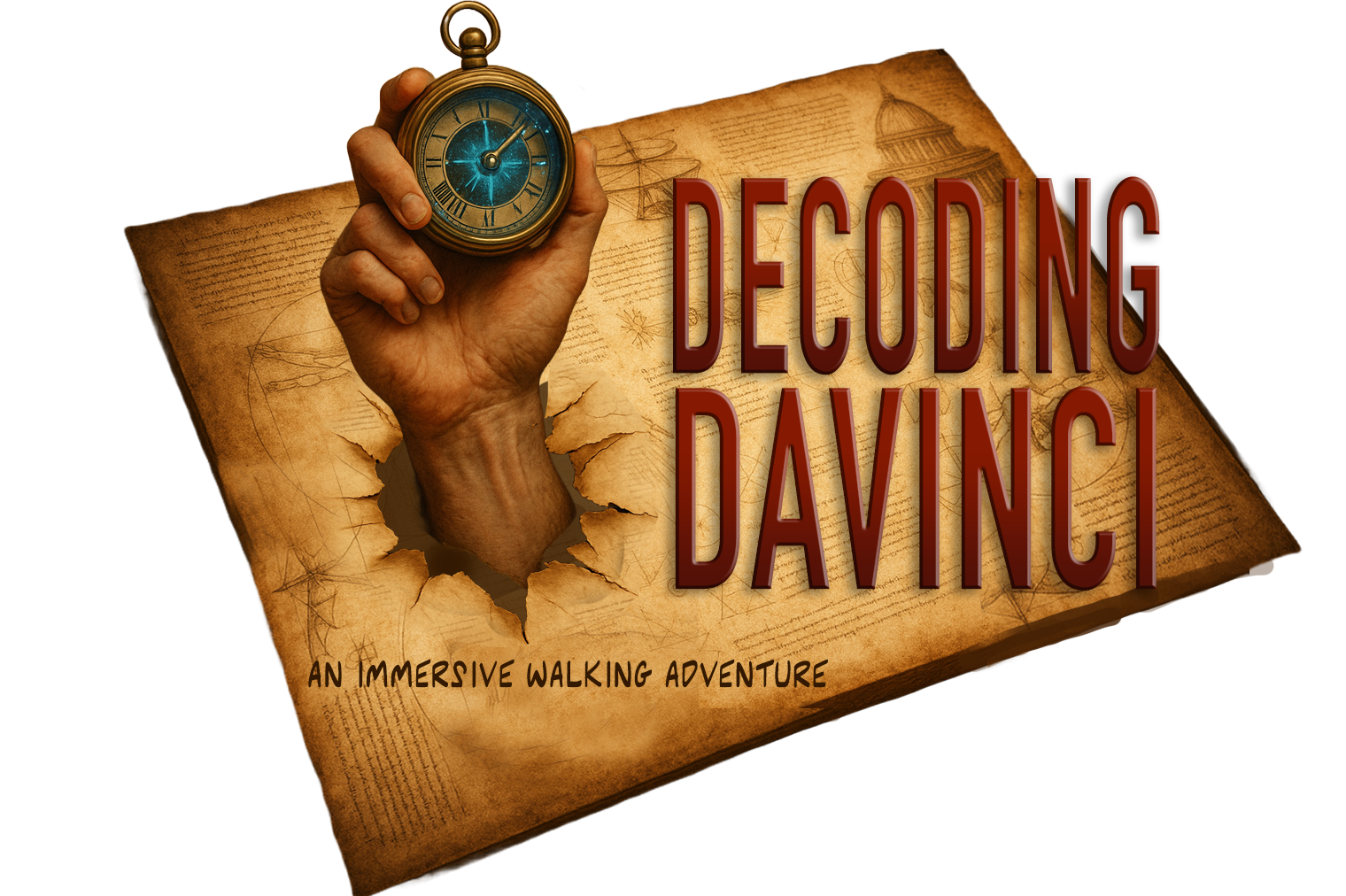 Decoding da Vinci is a city-wide immersive adventure/puzzle hunt that has players searching landmarks and interacting with live actors in search for keys to a secret society called The 7 Pillars. Inspired by a blueprint created by Leonardo Da Vinci, the founding fathers created a clandestine counsel solely in charge of secretly controlling every aspect of the city. Deep in the shadows, The 7 Pillars have controlled every aspect of society.